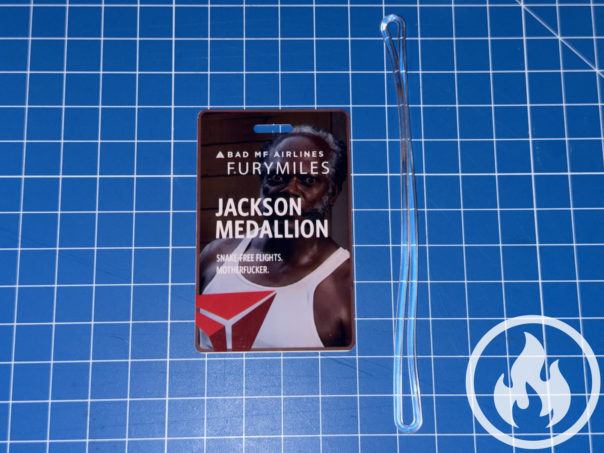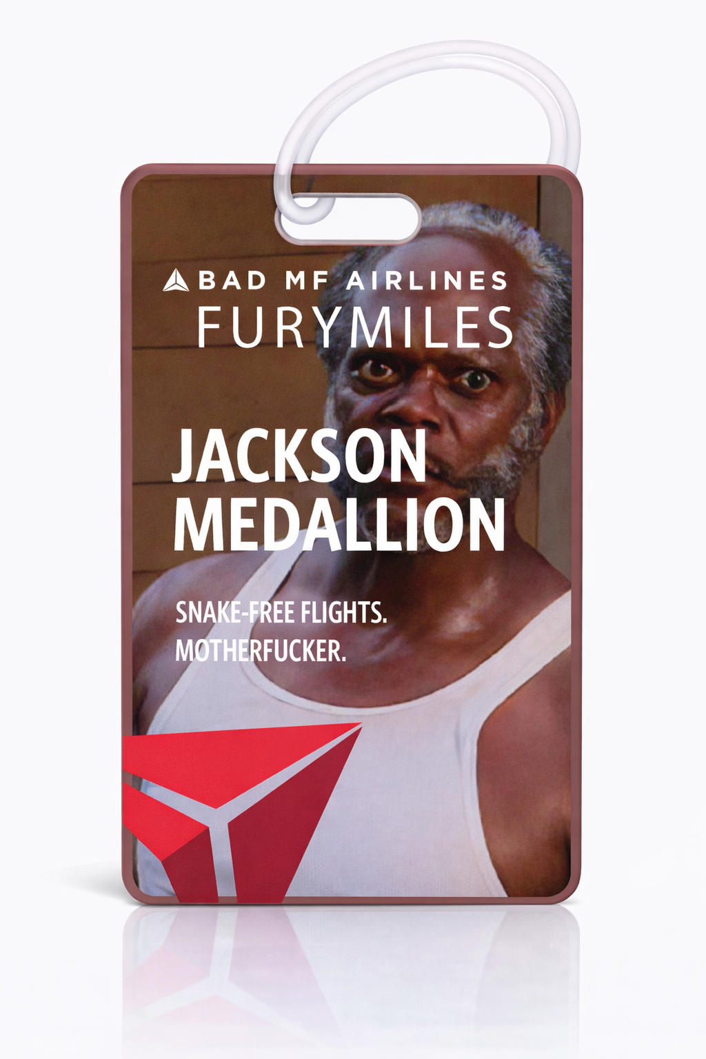 The Jackson Medallion is an airline loyalty parody inspired by the timeless truth that flying will test your patience, your sanity, and your ability not to yell at strangers in a boarding group vest. You have one goal. Get on the plane. Get off the plane. No surprises. No nonsense. No snakes.